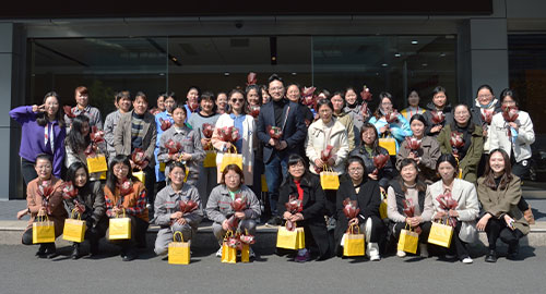 3月8日上午,江苏华盛、泰兴华盛公司为庆祝国际劳动妇女节,关爱全体劳动女同志们,总经理沈鸣亲自发放鲜花和礼品。