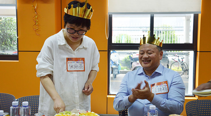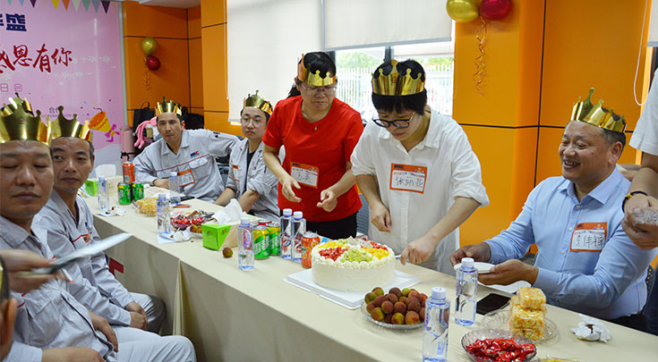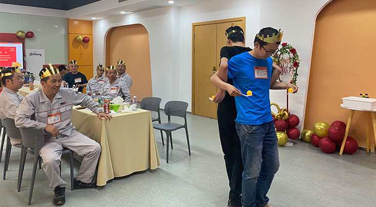 随着现场流程的推进逐渐欢快起来,进入集体切蛋糕环节,大家一起共享生日蛋糕带来的甜蜜与幸福,分蛋糕、品水果、忆往昔、话未来,好不快活。生日会游戏环节把现场气氛推向了最高潮,“你划我猜、小鸡啄米”两个互动小游戏进行分组比赛,寿星们发挥默契、相互配合共同完成游戏,最终由4位寿星(1号车间余海平、设备部贾国柱、生产部李嘉成、C车间黄杰)赢得了公司精心定制的5月夏季生日会伴手礼各1份。