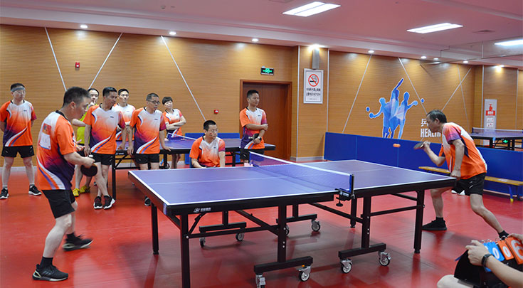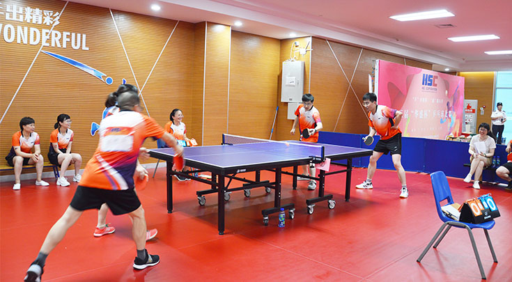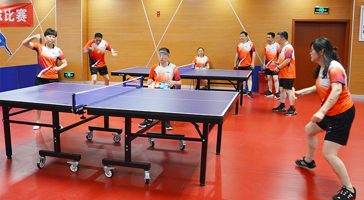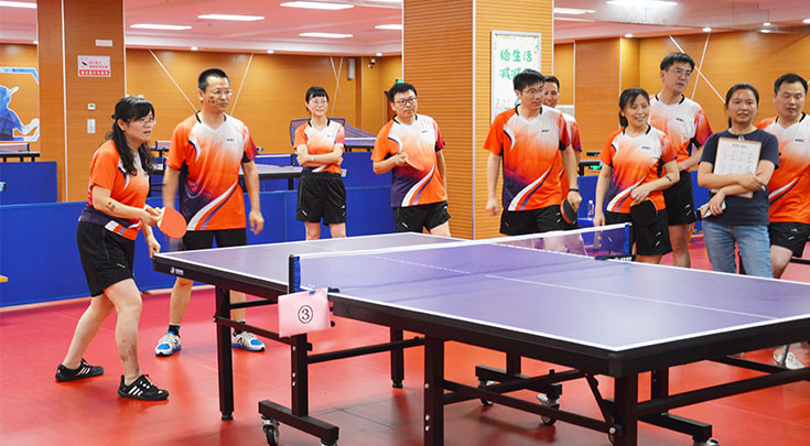 随后,生产部朱琪、徐嘉瑶一起带动全体参赛者进行简短的热身活动,让即将开始的比赛显得活力十足。热身操结束后,所有选手按照现场的抽签顺序进行比赛。第一个开始的项目,是乒乓球双打比赛,该项目比赛共有9组18名选手抽签组队而成,每组两两组队进行对决,经过近十轮激烈的角逐后,双打冠亚军季军随即产生,他们分别为:成国华、孙昌标(冠军);唐正凤、陆惠平(亚军);朱荣、丁耀荣(季军)。