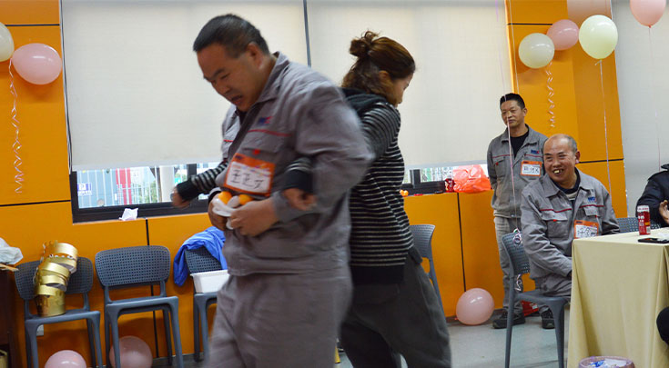 生日会开场,“生日快乐”祝福歌曲声在活动室温馨环绕,寿星们准时到达现场参加活动,主持人依次介绍11月寿星员工,并为寿星贴上“寿星名牌”。