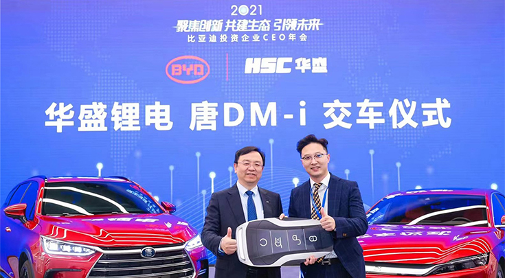 下午,比亚迪给予的投资企业年终订车福利-现车交付环节开始了,由比亚迪总裁王传福先生亲手交付公司提前预定的比亚迪-唐DM-i的“钥匙”到公司总经理沈鸣先生手中,沈鸣先生代表江苏华盛表示感谢并做简要讲话,双方共同合影留念。
