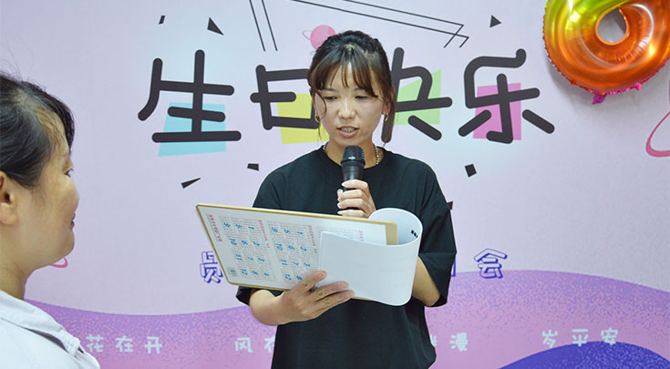 生日会开场,“生日快乐”祝福歌曲声在活动室温馨环绕,寿星们准时到达现场参加活动,主持人依次介绍8月寿星员工,并为寿星贴上“寿星名牌”。