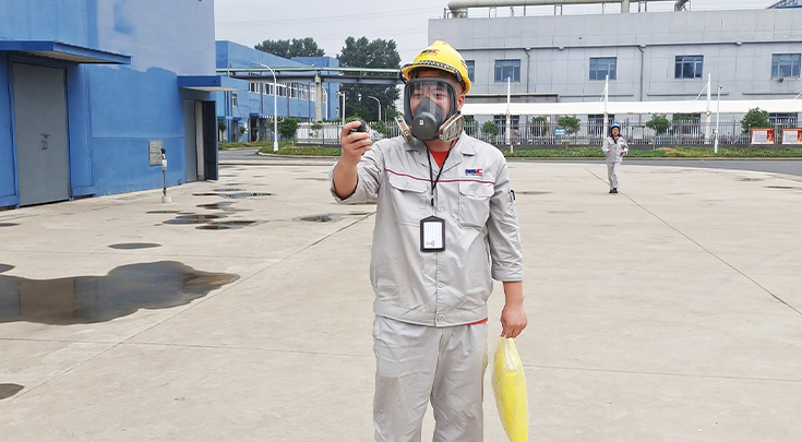 本次演练进行了“公司液氯气化车间液氯B罐出口管道发生泄漏”的场景设定。演练开始,厂区车间主任丁伟东接到罐体泄露警报后立即与总指挥顾建伟进行汇报,总指挥顾建伟接到消息立刻前往事故地点并通知各应急小组人员立即分工展开救援。