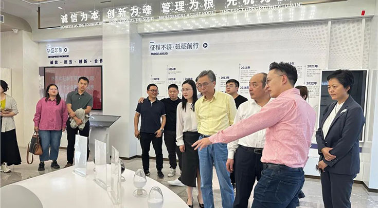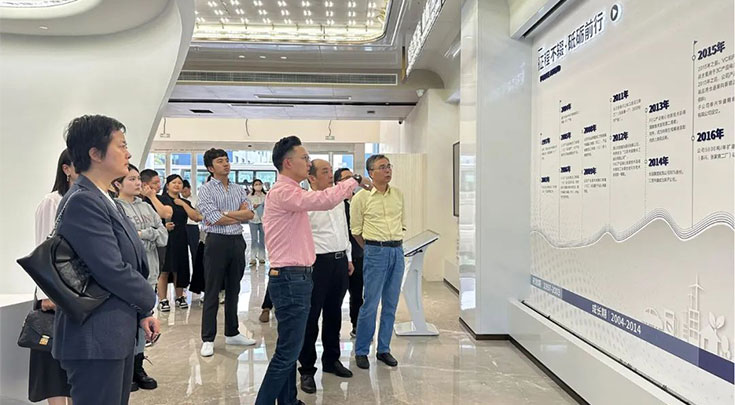 研学活动开始,徐主席一行领导参观华盛锂电展厅,内部主要展示公司历程、电解液添加剂产品和华盛锂电张家港工厂总布局。同步放映公司宣传片与产品册,加深大家对华盛的了解与认识。参观中,总经理沈鸣先生表示,以展厅直观展现公司产品与全貌,更好的让大家进行业务学习与交流。