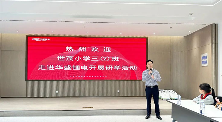 11月4日上午,张家港市世茂小学三(2)班师生及家长走进华盛锂电,开展“科技创新”研学活动。华盛锂电总经理沈鸣、副总经理、董事会秘书黄振东、人力资源总监郁慧祺、生产二部总监张涛、总部研究院院长助理杨志勇进行接待并表示热烈欢迎。