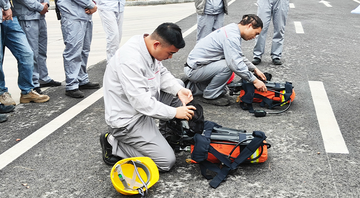 比赛现场,各位参赛队员摩拳擦掌,通过计时时长赛出名次,最后由生产总监张涛、安全总监袁青海、安环一部主管田鑫为获奖者颁奖,获奖人员为:正压式空气呼吸器穿戴第一名-付阳,双人组合操第一名-李胜利、张宇;正压式空气呼吸器穿戴第二名-张宇、甄玉超、茅晓峰,双人组合操第二名-蔚帅、金波、曾广平、周立峰、付阳、皇甫曦;正压式空气呼吸器穿戴第三名-付小丑、陶松、袁斌、李胜利、皇甫曦,双人组合操第三名-陶力强、付小丑、董前坤、陶松、刘浩、卜泽民、袁斌、成星华、闫帅宇、胡永辉。
