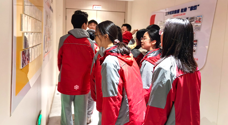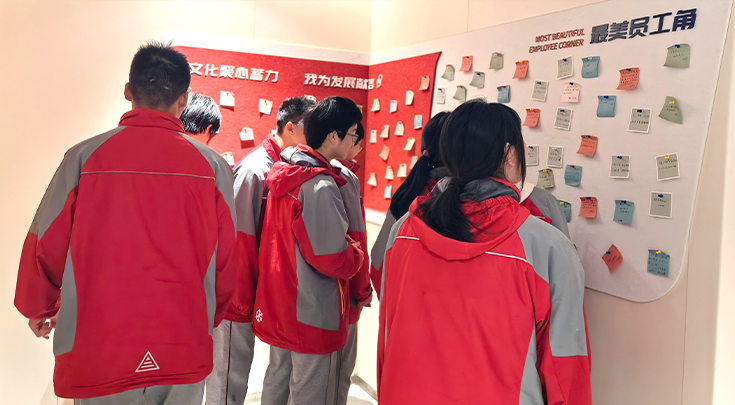 随后,参观生产辅房一楼文化墙,公司员工的一张张生动的活动照片,彰显了独特魅力与深厚内涵,让学生们目不转睛,更是感受到公司积极向上的企业文化。