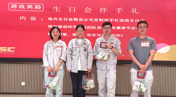 生日会的两个互动小游戏环节,现场气氛热烈,笑声此起彼伏,寿星们全员积极参与游戏,在欢声笑语中度过了难忘的生日,参与游戏的寿星们赢得了公司精心准备的生日会限定伴手礼各1份。